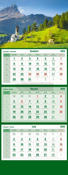 Główka pełnokolorowa, okienko przesuwane, nazwy miesięcy i tygodni w wersjach językowych, miejsce na nadruk reklamowy.