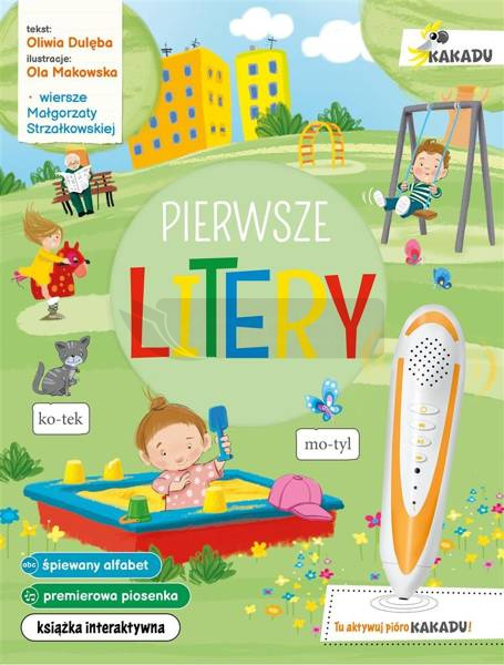 "Pierwsze litery" to interaktywna książka z piórem Kakadu (sprzedawanym oddzielnie), które uruchamia zakodowane na stronach teksty i dźwięki. Jest doskonałym wstępem do nauki czytania. Młodzi czytelnicy poznają Tomka i jego rodzinę, towarzyszą mu podczas urodzinowego przyjęcia, zakupów, na placu zabaw i w czasie wycieczki do zamku. Uczą sie przy tym liter, składania sylab, głoskowania i czytają pierwsze słowa. Dzięki odkrywaniu nazw poszczególnych elementów ilustracji i słuchaniu tekstów dziecko rozwija mowę i wzbogaca słownictwo. Co więcej, na każdej stronie może poćwiczyć i sprawdzić swoje umiejętności, odpowiadając na pytania. Publikacja zawiera nowe wiersze Małgorzaty Strzałkowskiej, a także premierową piosenkę o literach i śpiewany alfabet.