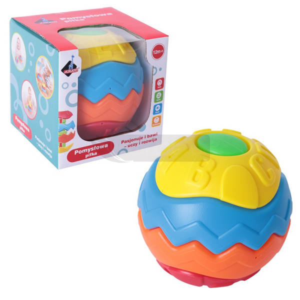 Począwszy od prostej piramidki a skończywszy na przykład na rakiecie czy latarni. Każdy element piłki ma inny kolor i teksturę co sprawi, że zabawka będzie długi czas interesująca. Piłka uczy kolorów, ćwiczy koncentrację ruchową i wzrokową, rozwija kreatywność i umiejętność układania. Dziecko może bawić się nią bezpiecznie przez długi okres czasu. Dodatkowo zabawka, dzięki łatwym elementom do uchwycenia wzmacnia nadgarstek i palce.