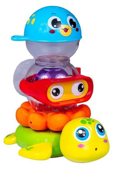 Składa się z trzech zwierzątek; rybki- durszlaka, ośmiorniczki ruszającej oczami i chodzącego żółwia, który po naciśnięciu będzie pryskał wodą.