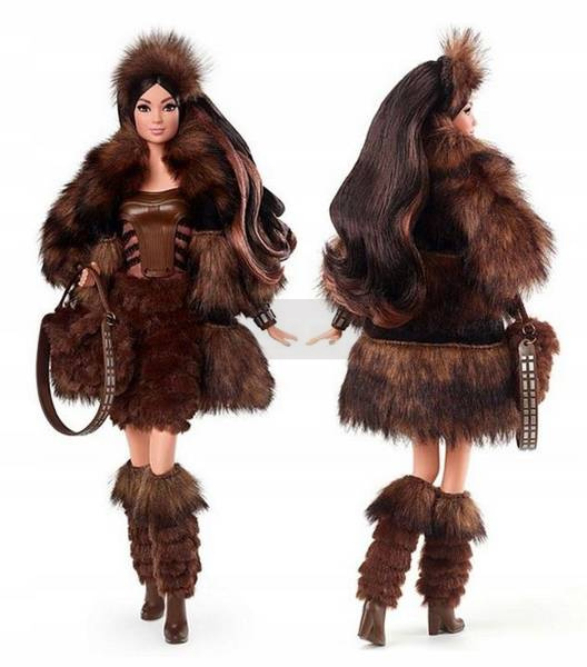 Lalka Star Wars Chewbacca x Barbie® ma na sobie bogaty płaszcz ze sztucznego futra na sukience bez ramiączek z futrzaną spódnicą i stanikiem z winylu i przezroczystej organzy.