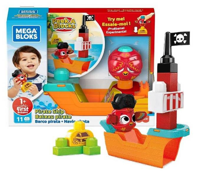 Ty i Twój maluszek pokochacie zabawę w budowanie statku pirackiego za pomocą tego wesołego zestawu. Mali budowniczowie mogą umieścić zwierzątko na klocku, aby zobaczyć, jak robi „a kuku”, a uroczy piracki kapelusz dla papugi dodatkowo urozmaici zabawę. Wystrzel papugę za pomocą wyrzutni, aby przetoczyła się przez statek. Idealne dla wszystkich małych budowniczych i fanów klocków z linii First Builders™. Dla dzieci od 1 roku życia. Zestaw zawiera 1 zwierzątko „A kuku”, 1 akcesorium, 1 statek, 1 wyrzutnię 7 dużych wytrzymałych klocków Nowość: załóż swojemu zwierzątku „A kuku” kapelusz, by urozmaicić zabawę - Umieść papugę na klocku, aby zobaczyć, jak robi „a kuku” Klocki są kompatybilne z pozostałymi zestawami z linii Mega Bloks® First Builders™ Klocki „A kuku” oraz innymi zabawkami do budowania Mega Bloks®. Klocki zapewniają mnóstwo nauki i zabawy! Idealna zabawka dla dzieci od 1 roku życia, rekomendowana przez Fisher-Price®. Klocki First Builders™ doskonale pasują do małych rączek dziecka i stanowią formę zręcznościowej zabawy, która pomaga rozwijać jego wyobraźnię oraz sprawność ruchową