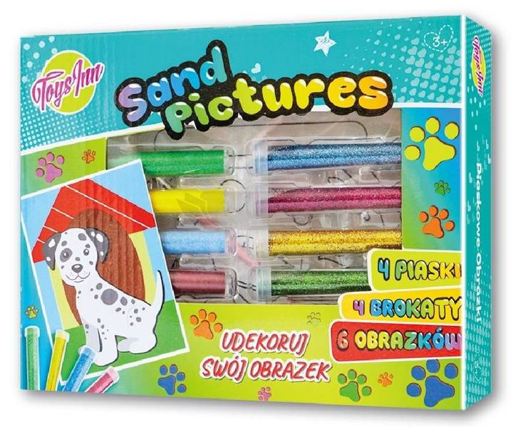 Zestaw piaskowych obrazków to wspaniała, kreatywna zabawa dla młodszych dzieci. Zestaw zawiera łącznie 6 obrazków z wizerunkami psa i kota. Obrazki pokryte są klejem, dzieki czemu wystarczy na dane miejsce nanieść 4 kolory piasku lub brokatu, by stworzyć niepowtarzalną kompozycję.