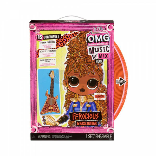Rozpakuj LOL Surprise OMG Remix Rock fashion doll Ferocious z 15 niespodziankami, w tym gitarą elektryczną. Ferocious jest członkiem Super Sonix, rockstarowego zespołu, który stworzył hit Im a Queen. Ma oszałamiające rysy twarzy, piękne, ułożone włosy i swój własny, skandaliczny styl gwiazdy rocka.