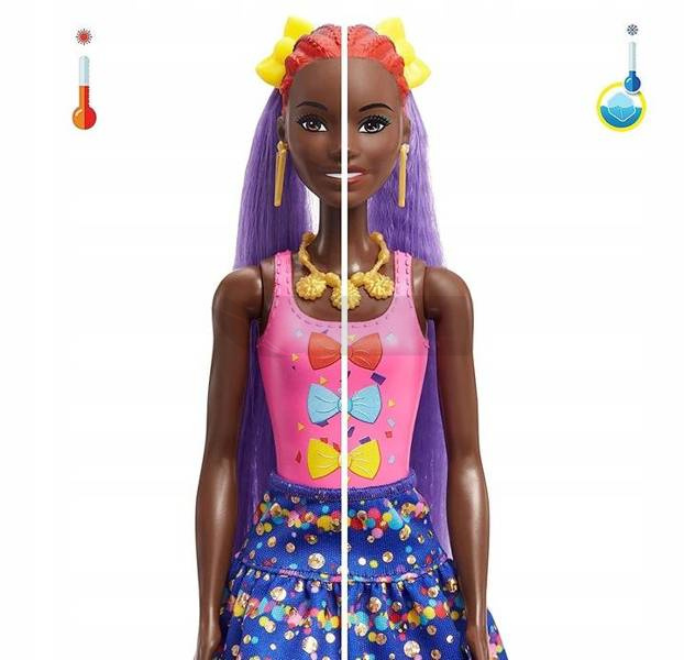 Te wspaniałe zestawy Barbie® Color Reveal™ Imprezowe stylizacje kryją mnóstwo niespodzianek! To błyszczące, brokatowe Barbie Color Reveal! Z 25 niespodziankami, lalki zmieniające włosy to najlepsza zabawa z rozpakowywaniem - wystarczy otworzyć przód i znaleźć 15 torebek niespodzianek z ukrytymi akcesoriami i pojemnikiem Barbie Color Reveal zaprojektowanym jak butelka lakieru do włosów! Wyjmij lalkę Color Reveal Barbie pokrytą niebieskim brokatem z pojemnika, napełnij go ciepłą wodą, a następnie zanurz lalkę w wodzie i obracaj ją tam i z powrotem. Woda zmienia kolor, a unoszący się w powietrzu połyskujący brokat tworzy magiczny efekt. Kiedy wyjmiesz lalkę, odsłoni się jej wygląd zewnętrzny. Inne niespodzianki to 10 rodzajów włosów, zwierzątko, ubrania, akcesoria, kula dyskotekowa z konfetti i nie tylko. Dzięki przypinanym włosom lalka Barbie i jej miłośnik zwierząt zawsze mogą wypróbować nowe fryzury. Fajnie jest przełączać się z jednego wyglądu na drugi. Jest tyle fajnych fryzur do odkrycia! A to nie wszystko… efekty zmiany koloru można aktywować lodowatą wodą, na przykład na ustach lalki Barbie lub na twarzy jej małej ukochanej. Dzieci mogą raz po raz przeżywać te chwile zmiany koloru z zimną lub ciepłą wodą. Wszystkie elementy dostępne osobno.