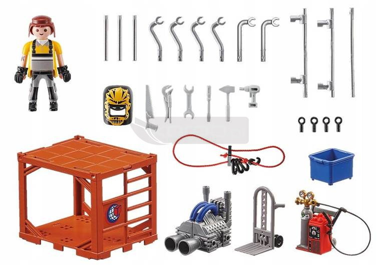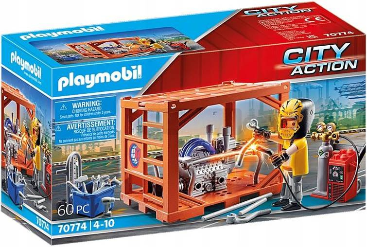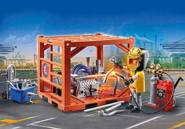 Bezpieczeństwo jest najwyższym priorytetem w porcie. Kontenery, które ważą tony, nie mogą się przypadkowo otworzyć ani zsunąć podczas transportu. Spawacz aktualnie sprawdza kontener w zakładzie produkcji kontenerów. Poluzowało się zapięcie. Natychmiast zakłada maskę ochronną, podnosi spawarkę i zabiera się do pracy. Ten problem rozwiązuje się w mgnieniu oka. W zestawie: figurkę PLAYMOBIL moduł pojemnika silnik narzędzia wiele innych akcesoriów. Z uwagi na drobne elementy, zestaw niedozwolony dla dzieci poniżej 4 roku życia.