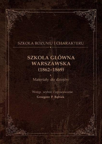 Tom materiałów do historii Szkoły Głównej Warszawskiej jest pierwszym, jaki podejmuje próbę całościowego zebrania najważniejszych źródeł do jej dziejów. Znalazły się w nim tak materiały dotąd niepublikowane, jak i wydane w epoce, a rozproszone w postaci druków ulotnych i artykułów prasowych. Całość uzupełnia bogaty materiał ikonograficzny, niekiedy publikowany po raz pierwszy, prezentujący ryciny z epoki, jak i dzisiejsze fotografie miejsc związanych ze szkołą, w tym także odnalezionych na cmentarzach różnych wyznań groby profesorów i uczniów Szkoły Głównej.