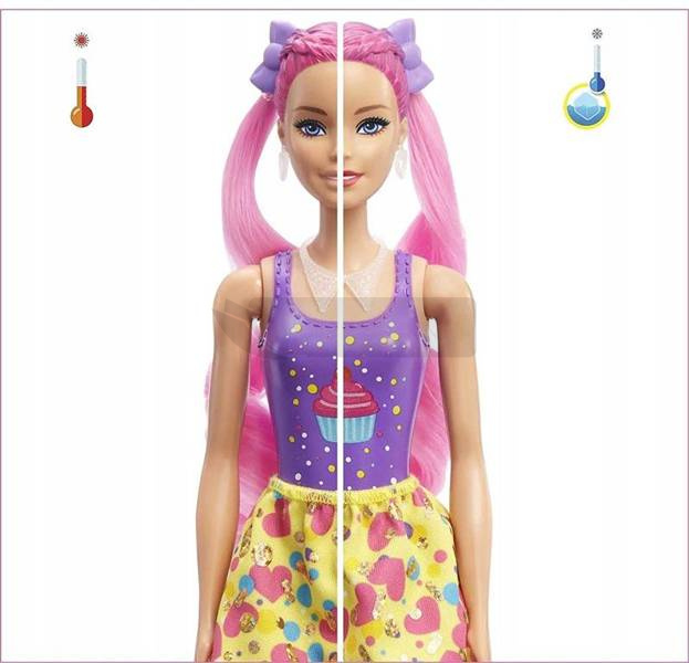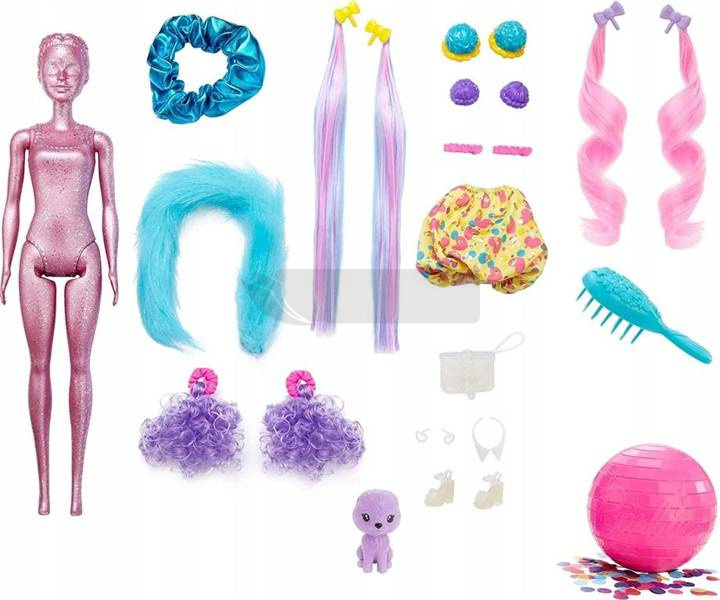 Te wspaniałe zestawy Barbie® Color Reveal™ Imprezowe stylizacje kryją mnóstwo niespodzianek! To błyszczące, brokatowe Barbie Color Reveal! Z 25 niespodziankami, lalki zmieniające włosy to najlepsza zabawa z rozpakowywaniem - wystarczy otworzyć przód i znaleźć 15 torebek niespodzianek z ukrytymi akcesoriami i pojemnikiem Barbie Color Reveal zaprojektowanym jak butelka lakieru do włosów! Wyjmij lalkę Color Reveal Barbie pokrytą niebieskim brokatem z pojemnika, napełnij go ciepłą wodą, a następnie zanurz lalkę w wodzie i obracaj ją tam i z powrotem. Woda zmienia kolor, a unoszący się w powietrzu połyskujący brokat tworzy magiczny efekt. Kiedy wyjmiesz lalkę, odsłoni się jej wygląd zewnętrzny. Inne niespodzianki to 10 rodzajów włosów, zwierzątko, ubrania, akcesoria, kula dyskotekowa z konfetti i nie tylko. Dzięki przypinanym włosom lalka Barbie i jej miłośnik zwierząt zawsze mogą wypróbować nowe fryzury. Fajnie jest przełączać się z jednego wyglądu na drugi. Jest tyle fajnych fryzur do odkrycia! A to nie wszystko… efekty zmiany koloru można aktywować lodowatą wodą, na przykład na ustach lalki Barbie lub na twarzy jej małej ukochanej. Dzieci mogą raz po raz przeżywać te chwile zmiany koloru z zimną lub ciepłą wodą. Wszystkie elementy dostępne osobno.
