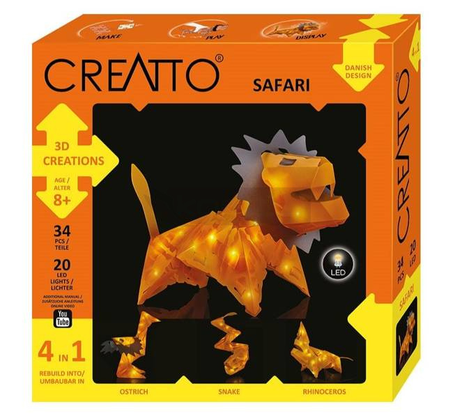 CREATTO to doskonały sposób, żeby spędzić czas z dzieckiem, jednocześnie razem tworząc coś magicznego. Z wytrzymałych, plastikowych elementów tworzymy trójwymiarowe figurki, które są podświetlane od środka światełkami LED. Mogą służyć nie tylko jako niezwykła lampka nocna ale również przywoływać wspomnienia wspaniałej, wspólnej zabawy. Używając tego zestawu można stworzyć lwa, strusia, węża lub nosorożca.