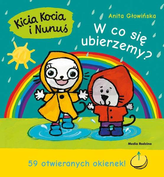 Kicia Kocia i Nunuś wiedzą, że w każdą pogodę można się dobrze bawić, trzeba się tylko odpowiednio ubrać. Nunuś wkłada kalosze, kiedy pada, ubiera się ciepło, kiedy jest mroźnie, a na plażę zabiera okulary przeciwsłoneczne i krem z filtrem. Nunuś wie już wszystko o pogodzie! Wszystkie odpowiednie ubrania i przedmioty ukryte są w otwieranych okienkach.