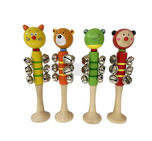 Metalowe dzwoneczki na drewnianym uchwycie wprowadzą dziecko w świat muzyki.