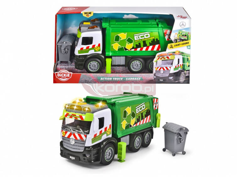 Śmieciarka na licencji marki Mercedes z funkcją światła i dźwięku, ruchomymi elementami oraz podnoszoną ładownią na śmieci. Pojazd posiada także dodatkowe akcesoria, takie jak kontener na śmieci.