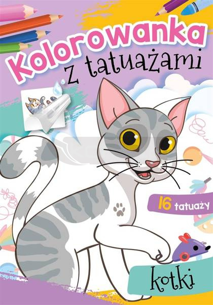 W środku: projekty do kolorowania i zestaw zmywalnych tatuaży (wzory kolorystyczne).