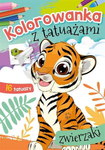 W środku: projekty do kolorowania i zestaw zmywalnych tatuaży (wzory kolorystyczne).
