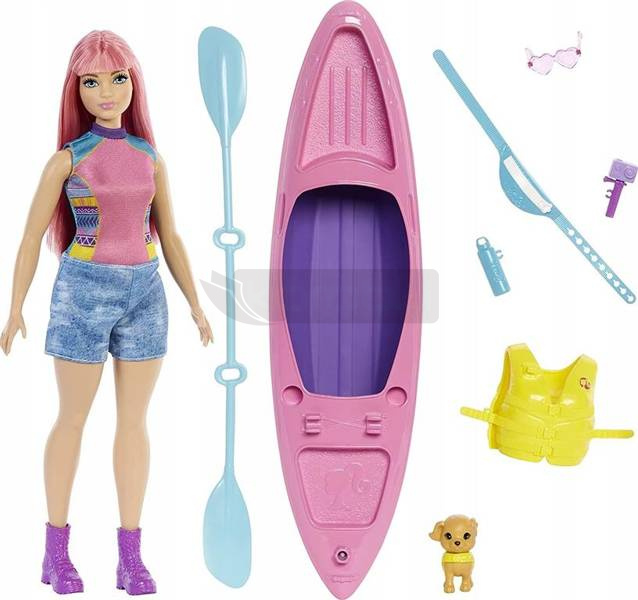 Dołącz do lalek Barbie® „Malibu” i „Brooklyn” w ich największej przygodzie z lalkami Barbie® inspirowanymi filmem It Takes Two! Dzieci mogą zabrać lalkę Barbie® „Daisy” na niesamowitą wycieczkę na kemping z jej szczeniakiem na świeżym powietrzu, które inspirują do wszelkiego rodzaju zabawy w opowiadanie historii. Gotowy do rozpoczęcia zwiedzania? Ubierz lalkę Daisy i jej szczeniaka w kamizelki ratunkowe i posadź je w kajaku — jest w nim specjalne miejsce dla szczeniaczka! Uchwyty na wiosłach ułatwiają lalce Daisy chwytanie, kamera aktywności montowana jest z przodu kajaka, aby udokumentować jej podróż, a dołączona butelka wody zapewnia jej nawodnienie przez cały dzień. Lalka Daisy jest gotowa na całodzienną zabawę w fajnym stroju kempingowym, a nerka i stylowe okulary przeciwsłoneczne dopełniają jej gotowy na przygodę look. Dzięki tak wielu możliwościom opowiadania historii ta lalka i zestaw Barbier It Takes Two inspiruje dzieci w wieku od 3 do 7 lat do snucia niekończących się przygód na świeżym powietrzu
