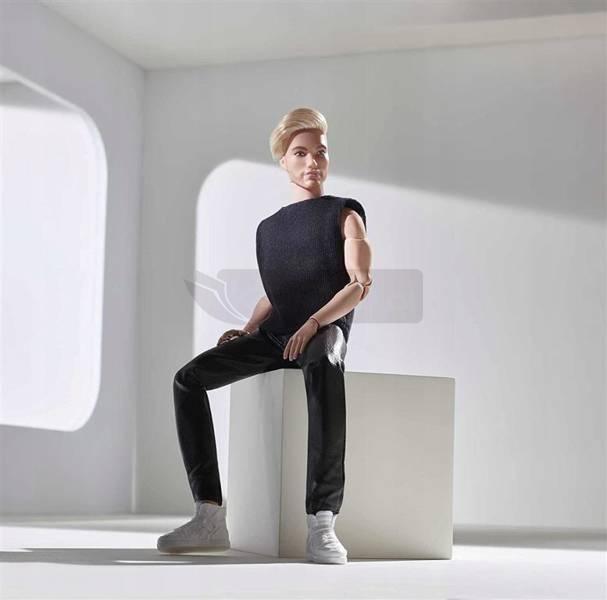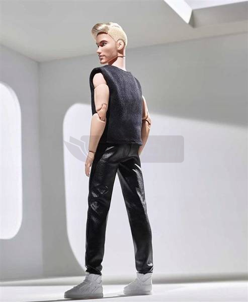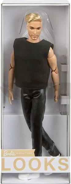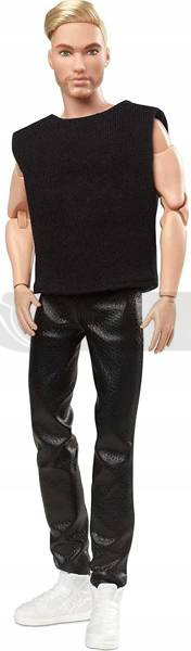 Ta lalka Barbie Looks Ken ma na sobie czarną koszulkę bez rękawów, czarne winylowe spodnie i białe buty za kostkę.
