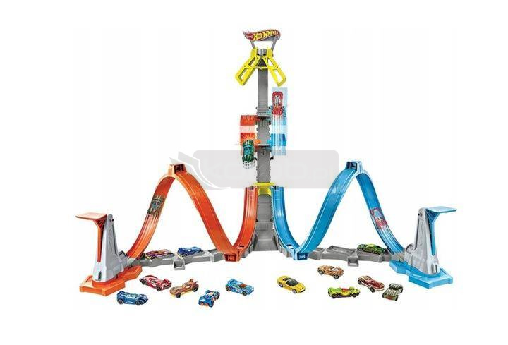 Zestaw do zabawy Hot Wheels® Wieża Starcie na wysokości wynosi rywalizację na nowy poziom, gdy pojazdy ścigają się do klatki zwycięzcy, którą można ustawić na wysokości nawet ok. 60 cm!