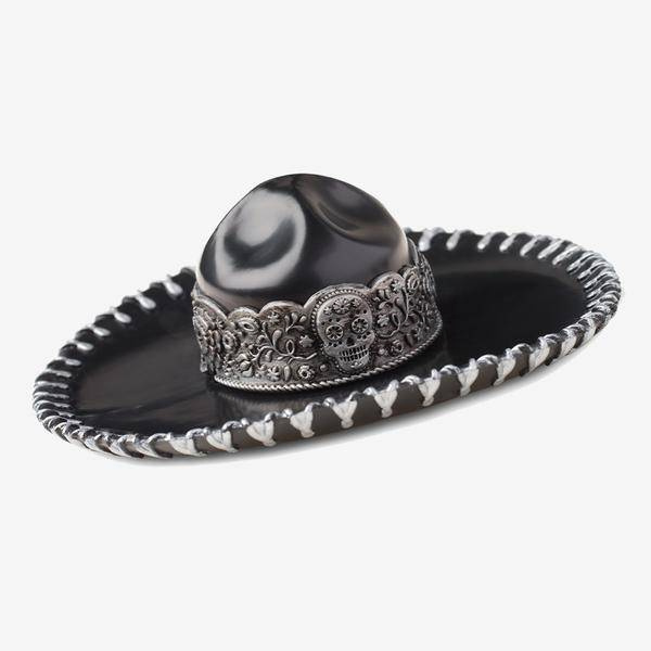 Jego sombrero i sprzączkę paska zdobi srebrzysta rzeźbiona cukrowa czaszka, a twarz pomalowana jest w efektowny wzór kalawery.