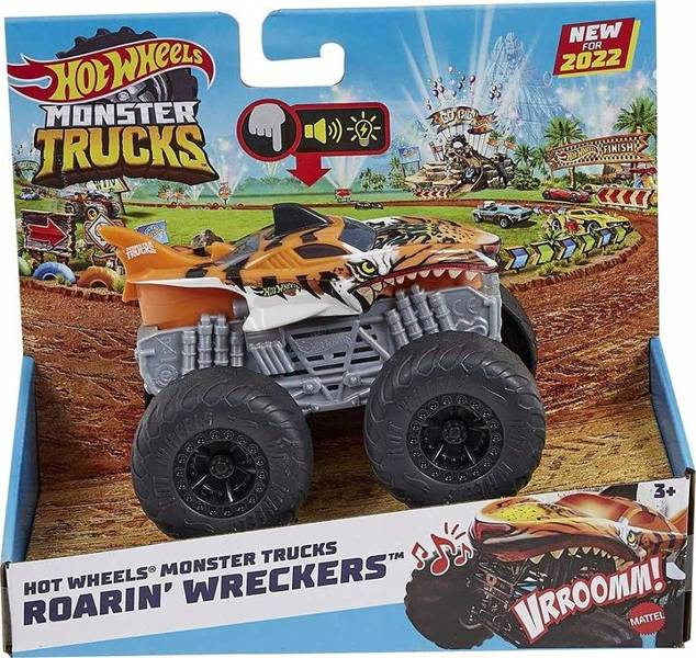Hot Wheels Monster Truck Hot Wheels Monster Trucks został ożywiony dla maksymalnej zabawy efektami świetlnymi oraz dźwiękowymi! Za naciśnięciem jednego przycisku odtwarzane są imponujące odgłosy silnika i zderzenia. Przez okno widać światło, co zapewnia jeszcze bardziej realistyczną i ekscytującą zabawę. Dzięki innym pojazdom z kolekcji Hot Wheels Monster Trucks, takim jak Bone Shaker, HW Demo Derby i Race Ace, możesz przeprowadzać ekscytujące wyścigi w dowolnym miejscu (wszystkie przedmioty sprzedawane osobno). Pojazd wykonany jest w skali 1:43, jest wyposażony w ogromne koła popularne wśród fanów Monster Truck oraz stylowe elementy konstrukcyjne. Ten wspaniały Monster Truck jest idealny dla młodych fanów, dla dzieci w wieku od 3 lat i promuje kreatywne myślenie dzięki autentycznemu designowi