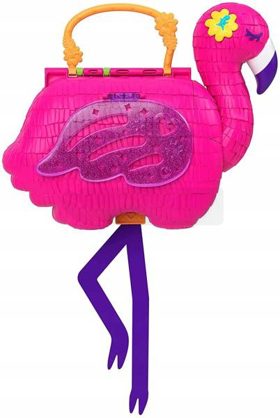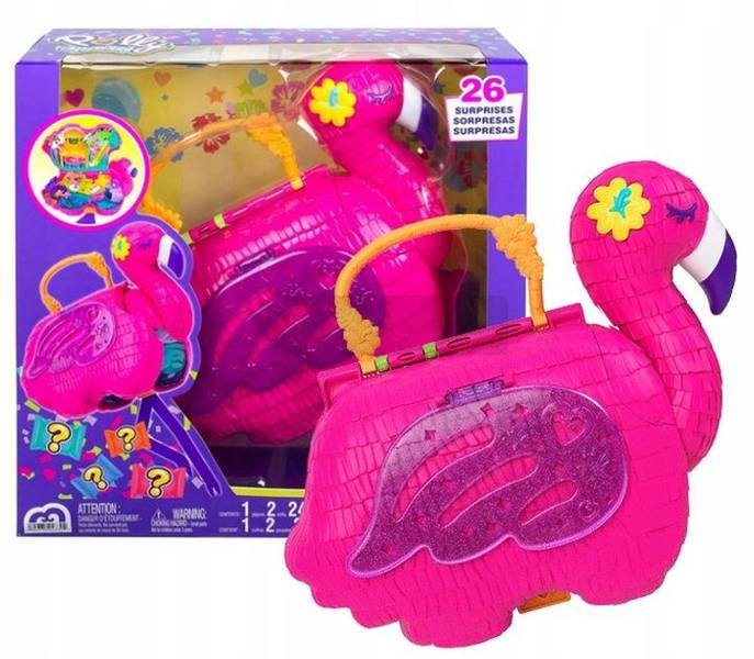 Mieliście już okazję poznać Polly Pocket? Ta mała, przebojowa dziewczyna jest główną bohaterką serialu animowanego o takim samym tytule. Jasnowłosa nastolatka ma w sobie mnóstwo pozytywnej energii i same szalone pomysły. Pewnego dnia dziewczynka dostała od swojej babci piękny naszyjnik ze złotym medalikiem. Jak się później okazało, ten wspaniały prezent to magiczny amulet, którego zmniejsza Polly do kieszonkowych rozmiarów. Miniaturowa postać dziewczynki ma wysokość około 4 cali, czyli zaledwie 10-ciu centymetrów! Ma to swoje oczywiste zalety i pozwala na zabawę, o jakiej dziewczyna wcześniej nawet nie śniła! Powierniczkami wielkiej tajemnicy Polly są jej dwie najlepsze przyjaciółki: Shani i Lili. Na nie także działa moc magicznego medalika, a przygoda smakuje lepiej w towarzystwie! Przygotuj się na tropikalne przyjęcie z zestawem Polly Pocket™ Flaming - Plażowa impreza! Ten duży zestaw w kształcie flaminga-piniaty ma uchwyt ułatwiający przenoszenie. Aby rozpocząć przyjęcie, pociągnij za nogi flaminga i podziwiaj, jak ze środka wypada kolorowe konfetti oraz 26 niespodzianek. Niektóre niespodzianki są zapakowane – możesz odkryć je od razu albo zostawić na później! Wiele z niespodzianek ma specjalne zaczepy, więc możesz przyczepiać je w różnych miejscach zestawu, aby poszerzać możliwości zabawy. Otwórz zestaw, aby rozpocząć tropikalną przygodę z 2 mikrolalkami. Znajdziesz tu całe mnóstwo atrakcyjnych funkcji. Przypnij lalkę do pnia palmy, aby wspinać się na sam czubek. Przyczep małpkę do drzewa, a potem lalkę do małpki, aby lalka mogła się pobujać. Przekręć duży liść w chatce, aby odsłonić bankiet i obrotowy parkiet taneczny. Otwórz skrzynię ze skarbem i znajdź miejsce do przechowywania. Przymocuj elementy z zaczepami na dachu chatki, czubku drzewa, plaży i w wodzie. Przyczep na wodzie deskę surfingową, flamingowe koło do pływania i delfina. Odkryj nieskończone możliwości zabawy. To wspaniały prezent urodzinowy i świąteczny dla dzieci od 4 roku życia
