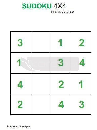 Sudoku dla seniorów to 60 układanek. W dużym formacie co wpływa na łatwiejszą pracę z ćwiczeniami. Zadania są duże i przejrzyste tak by osoby starsze nie miały problemów z ich rozwiązywaniem. W opracowaniu pojawiają się nie tylko cyfry ale też figury geometryczne co pozwala na wprowadzenie różnorodności i nauki sudoku od podstaw dla tych użytkowników, którzy nie mieli z nim jeszcze do czynienia. Oczywiście można skopiować i wydrukować każdy kwadrat a zaletą tego pomysłu jest wykorzystanie figur geometrycznych i liter, nie tylko cyfr. Dostępne są 3 zeszyty do rozwiązywania.