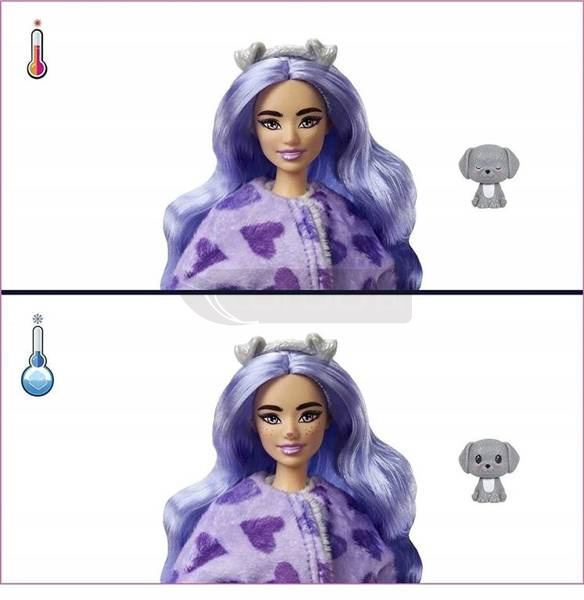 Cutie Reveal to seria lalek w przebraniach słodkich zwierzaków Rozpakowywanie lalek Barbie® Cutie Reveal™ to świetna zabawa dzięki 10 niespodziankom, w tym lalce Barbie z punktami zgięcia! W opakowaniu znajdziesz mięciutkiego pieska i 4 torebki-niespodzianki. Gdy zdejmiesz z lalki kostium pandy, odkryjesz pod nim lalkę Barbie® z długimi włosami oraz lśniącymi detalami. Otwórz torebki-niespodzianki, aby znaleźć błyszczące ubranko, akcesoria, gąbkę-grzebień i malutkiego pieska. Dzieci mogą przebierać lalkę Barbie® i dobierać akcesoria – góra kostiumu po odwróceniu staje się kurtką z niezwykle miękkiego polaru, a głowa kostiumu legowiskiem dla zwierzątka! Ale to jeszcze nie koniec niespodzianek! Czas na transformację ze zmianą koloru. Na twarzy Barbie® pojawia się makijaż inspirowany zwierzątkiem, a jej uroczy piesek „otwiera i zamyka” oczy. Aby aktywować zmianę koloru, wystarczy użyć zimnej wody i gąbki-grzebienia. Użyj ciepłej wody, aby wrócić do pierwotnego wyglądu. W serii Barbie® Cutie Reveal™ magicznym zachwytom nie ma końca! W zestawie znajdziesz 1 lalkę w kostiumie zwierzątka i 10 niespodzianek.