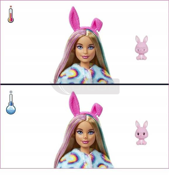 Cutie Reveal to seria lalek w przebraniach słodkich zwierzaków Rozpakowywanie lalek Barbie® Cutie Reveal™ to świetna zabawa dzięki 10 niespodziankom, w tym lalce Barbie z punktami zgięcia! W opakowaniu znajdziesz mięciutkiego króliczka i 4 torebki-niespodzianki. Gdy zdejmiesz z lalki kostium króliczka, odkryjesz pod nim lalkę Barbie® z długimi włosami oraz lśniącymi detalami. Otwórz torebki-niespodzianki, aby znaleźć błyszczące ubranko, akcesoria, gąbkę-grzebień i malutkiego króliczka. Dzieci mogą przebierać lalkę Barbie® i dobierać akcesoria – góra kostiumu po odwróceniu staje się kurtką z niezwykle miękkiego polaru, a głowa kostiumu legowiskiem dla zwierzątka! Ale to jeszcze nie koniec niespodzianek! Czas na transformację ze zmianą koloru. Na twarzy Barbie® pojawia się makijaż inspirowany zwierzątkiem, a jej uroczy króliczek „otwiera i zamyka” oczy. Aby aktywować zmianę koloru, wystarczy użyć zimnej wody i gąbki-grzebienia. Użyj ciepłej wody, aby wrócić do pierwotnego wyglądu. W serii Barbie® Cutie Reveal™ magicznym zachwytom nie ma końca! W zestawie znajdziesz 1 lalkę w kostiumie zwierzątka i 10 niespodzianek.