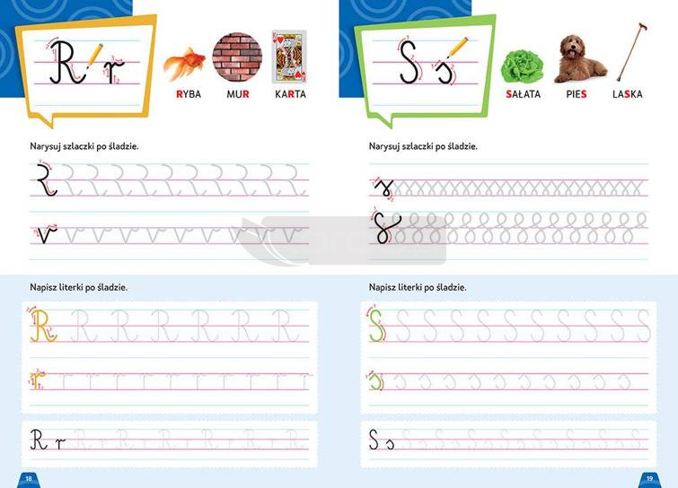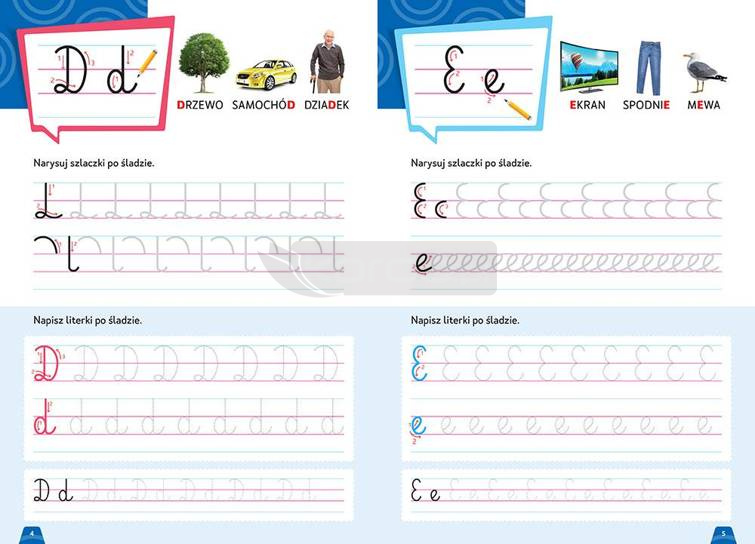 Każda strona poświęcona jest jednej literce. Ćwiczenia rozpoczynają się od szlaczków, które pomyślane są w ten sposób, by rzeczywiście odwzorowywały jakiś fragment literki i przygotowywały rączkę do jej pisania - gwarantuje to, że korzystanie z nich jest przydatne. Następnie dziecko może poćwiczyć pisanie konkretnej literki - najpierw większej, a potem wielkości takiej, jak w szkolnych zeszytach. Strzałki we wzorze literki pokazują, jak należy poprawnie prowadzić długopis. Dodatkowo na każdej stronie dziecko znajdzie przykład występowania danej literki w słowach - na początku, na końcu i w środku, wraz z estetycznymi ilustracjami. Książeczka jest czytelna, przyjemna dla oka i zachęcająca malucha do ćwiczeń.