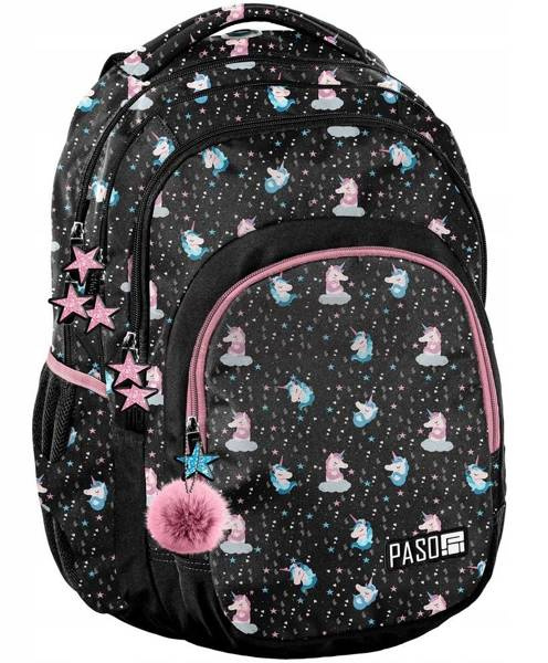 Plecak szkolny. Trzy pojemne komory, kieszeń przednia z organizerem, 2 boczne kieszenie z siatki+materiał. Wzmocnione profilowane plecy, miękkie wygodne szelki. Wzmocniony i usztywniony spód. Wygodny uchwyt do przenoszenia i uszko do powieszenia. W komorze głównej przegroda (na laptop), w drugiej komorze organizer z kieszenią na zamek, uchwyt na klucze. Elementy odblaskowe dla większego bezpieczeństwa.