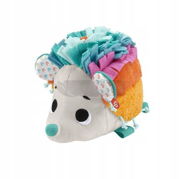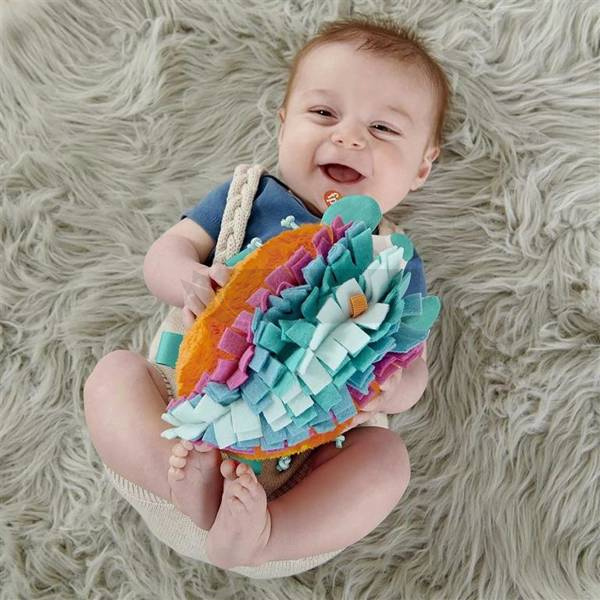 Mięciutka przytulanka pluszowy, kolorowy jeżyk z dźwiękami i fakturami stymulującymi zmysły dziecka. 8 różnych tekstur, w tym miękkie kolce, wyszywana buzia, wiązane sznureczki i wstążki przemawiają do zmysłów dotykowych dziecka. To wszystko brzmi jak świetna zabawa! Ten słodki przyjaciel jeż ma pomarszczony brzuch, piszczący nos i dzwoni, gdy się potrząsa. Jeżyk posiada pętelki do mocowania dodatkowych zabawek w podróży (dodatkowe zabawki sprzedawane osobno) Ta sensoryczna zabawka nadaje się dla maluszków już od 3 m-ca życia