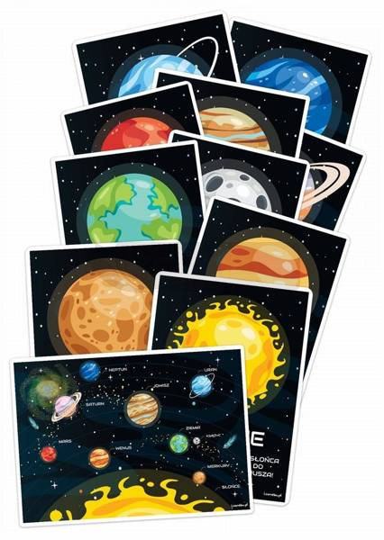 10 kart zawierających planety oraz ciekawostki o każdej z nich + 1 karta przedstawiająca układ słoneczny wraz z rozmieszonymi na nim planetami i podpisami.