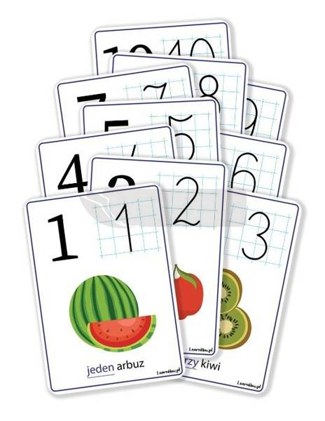 Zestaw zawiera 10 kart w formacie A4(297mm x 210mm), karty są drukowane na grubym papierze 300g, dwustronnie zafoliowane oraz mają zaokrąglone rogi dla komfortu i bezpieczeństwa użytkowania.Zestaw zawiera następujące cyfry: 1, 2, 3, 4, 5, 6, 7, 8, 9, 10.