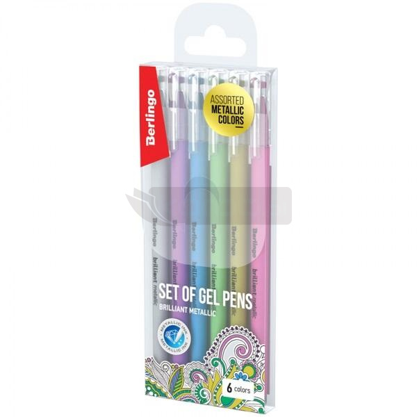 Zestaw żelowych długopisów Berlingo Brilliant Metallic w 6 metalicznych kolorach (złoty, srebrny, różowy, niebieski, fioletowy, zielony).