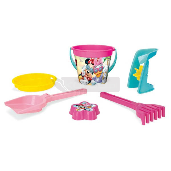 Komplet do piasku składający się z 6 elementów w klasycznych kolorach i grafikami z Myszką Minnie spodoba się wszystkim miłośnikom twórczej zabawy w piasku. W skład zestawu wchodzą: okrągłe wiaderko, łopatka, grabki, sitko, młynek i foremka. Poszczególne elementy posiadają ciekawą grafikę wykonaną metodą IML. Dzięki temu wytrzyma ona kontakt z wodą i słońcem. Komplet do Piasku daje możliwość kreatywnej zabawy dziecku, zarówno w towarzystwie, jak i bez. Zestaw pobudza wyobraźnię najmłodszych. Daje szansę poznania i zaproszenia do wspólnej zabawy nowych znajomych, co pomoże dziecku w rozwoju jego kompetencji społecznych, nauczy zachowania w grupie. Twórcza zabawa w piasku pobudza wyobraźnię dzieci, wspiera ich aktywność ruchową oraz sprawność i koordynację manualną oraz motoryczną. Całość wyprodukowana z nietoksycznych, bezpiecznych i wytrzymałych materiałów.