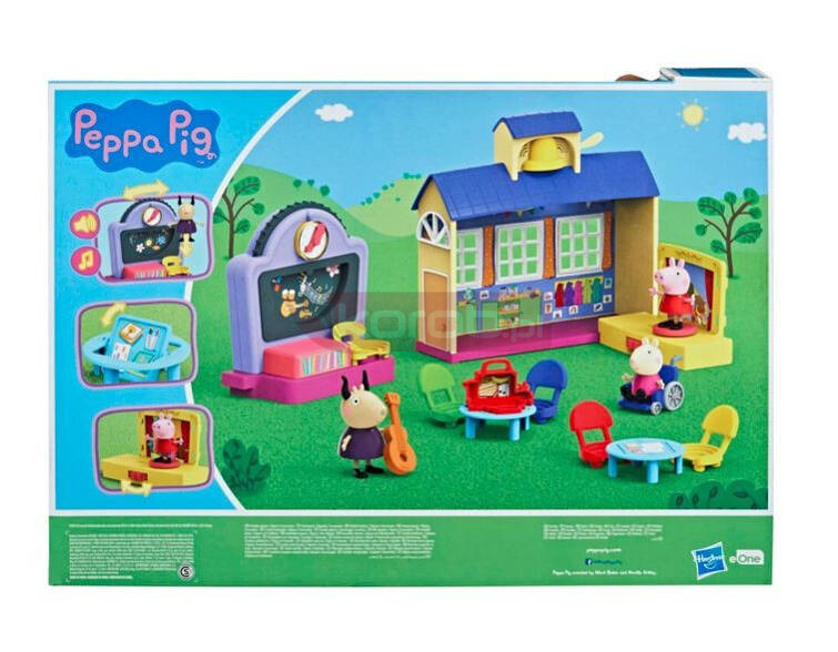 Szkoła Świnki Peppy to miejsce, gdzie można spędzać czas na muzyce, sztuce, zajęciach plastycznych oraz tworzeniu niesamowitych historii! Usłysz głos Pani Gazeli oraz inne dodatkowe dźwięki. Przesuń tarczę, by aktywować narrację i zobacz, jak zmienia się temat na szkolnej tablicy! W zestawie dwie figurki i ponad 5 akcesoriów, z czego dwa z dodatkowymi funkcjami.