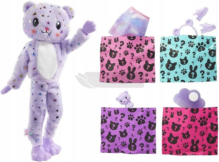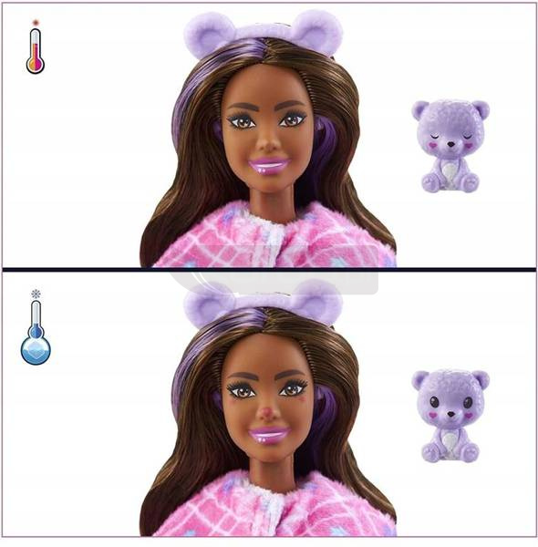 Cutie Reveal to seria lalek w przebraniach słodkich zwierzaków Rozpakowywanie lalek Barbie® Cutie Reveal™ to świetna zabawa dzięki 10 niespodziankom, w tym lalce Barbie z punktami zgięcia! W opakowaniu znajdziesz mięciutkiego króliczka i 4 torebki-niespodzianki. Gdy zdejmiesz z lalki kostium króliczka, odkryjesz pod nim lalkę Barbie® z długimi włosami oraz lśniącymi detalami. Otwórz torebki-niespodzianki, aby znaleźć błyszczące ubranko, akcesoria, gąbkę-grzebień i malutkiego króliczka. Dzieci mogą przebierać lalkę Barbie® i dobierać akcesoria – góra kostiumu po odwróceniu staje się kurtką z niezwykle miękkiego polaru, a głowa kostiumu legowiskiem dla zwierzątka! Ale to jeszcze nie koniec niespodzianek! Czas na transformację ze zmianą koloru. Na twarzy Barbie® pojawia się makijaż inspirowany zwierzątkiem, a jej uroczy króliczek „otwiera i zamyka” oczy. Aby aktywować zmianę koloru, wystarczy użyć zimnej wody i gąbki-grzebienia. Użyj ciepłej wody, aby wrócić do pierwotnego wyglądu. W serii Barbie® Cutie Reveal™ magicznym zachwytom nie ma końca! W zestawie znajdziesz 1 lalkę w kostiumie zwierzątka i 10 niespodzianek.