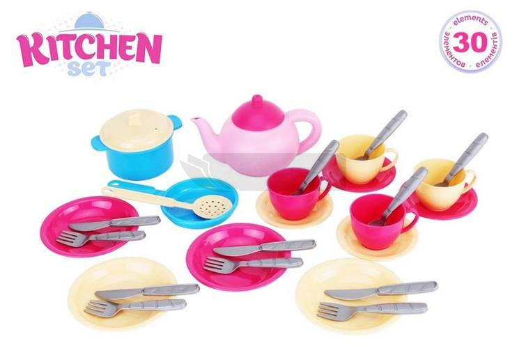 W skład zestawu wchodzą: czajniczek z pokrywką, 4 filiżanki i spodki, 4 talerze, sztućce, rondel z pokrywką, patelnia, przybory kuchenne.