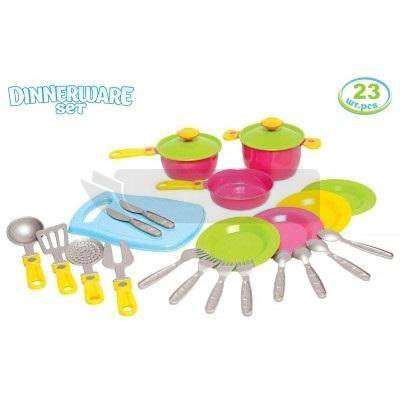 W skład zestawu wchodzą: 2 garnki i patelnie z pokrywkami, 4 kubki na talerzach, 4 łyżki.