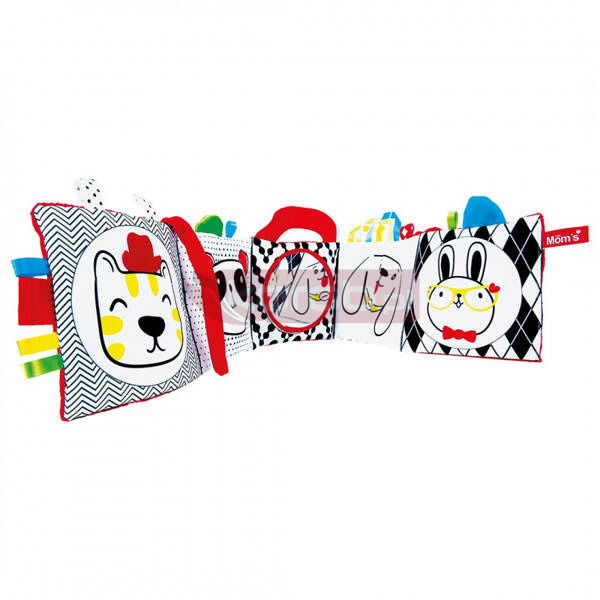 Biało-czarno-czerwona książeczka pełna jest niespodzianek. Prawa strona książeczki zawiera różnorodne rysunki zwierzątek, duże lusterko, które zaciekawi każdego malucha oraz szeleszczące strony. Druga strona książeczki uszyta jest z biało-czarnej bawełny oraz czerwonej minky, takie zestawienie materiałów i kolorów najbardziej rozwija Twoje dziecko. Wszystkie te elementy zapewnią dziecku wspaniałą zabawę na długi czas, dodatkowo stymulując jego zmysły. Książeczka jest bardzo lekka i bezpieczna dla Twojego dziecka, które może się nią bawić na płasko. Dzięki długości, aż 80 cm oraz dodatkowym sznureczkom, książeczka może służyć jako osłonka do łóżeczka.