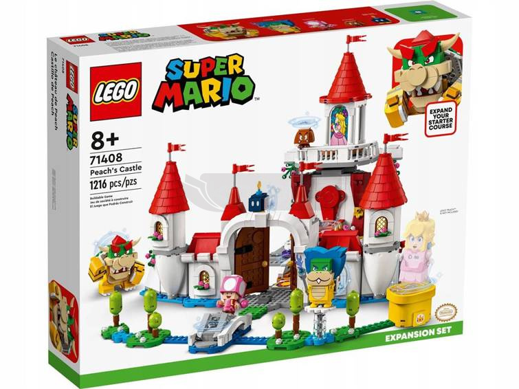 Zestaw Zamek Peach — zestaw rozszerzający (71408) pozwala dzieciom wzbogacić swój świat LEGO® Super Mario™ o dobrze znany poziom. Razem z interaktywnymi figurkami LEGO® Mario™, LEGO® Luigi™ lub LEGO® Peach™ (figurki nie są częścią zestawu) gracze mogą zwiedzić nowe miejsce i zbierać cyfrowe monety na wiele sposobów. W zestawie są sala tronowa z obracającą się ścianą, za którą chowa się Bowser, witraż z wizerunkiem Peach, obraz ze znacznikiem akcji przedstawiający Bob-ombę, ciasto z Goombą w środku, specjalna rura zamku Peach, blok czasu, „uszkodzony” most, miska owoców z fioletowym owocem i nie tylko. (Uwaga: do interaktywnej zabawy wymagany jest zestaw startowy 71360, 71387 lub 71403).
