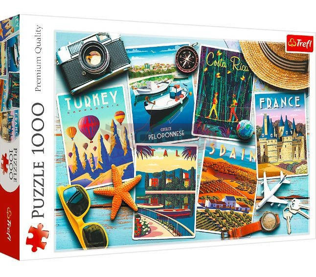 Puzzle składające się z 1000 elementów przedstawiające pocztówki. Po ułożeniu powstanie obraz o wymiarach 683x480 mm.