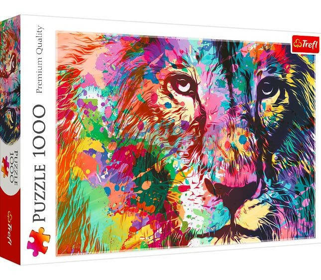 Puzzle składające się z 1000 elementów przedstawiające kolorowego lwa. Po ułożeniu powstanie obrazek o wymiarach 68,3 x 48 cm.