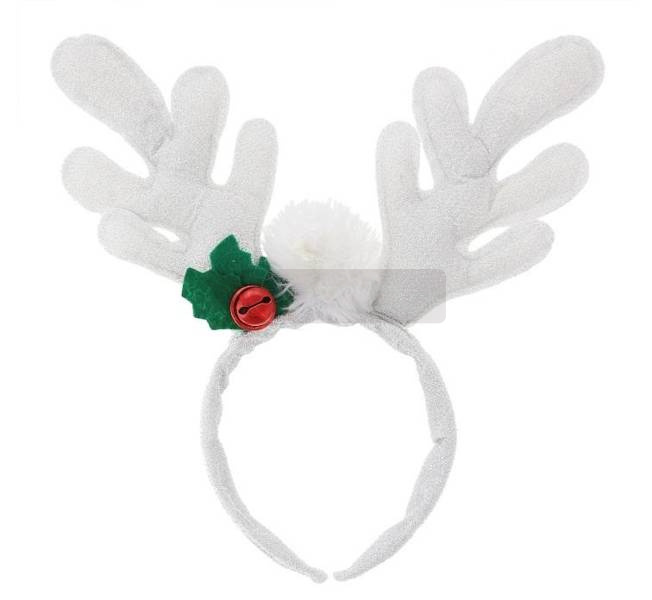 Opaska ROGI RENIFERA, srebrna Długość rogów 17 cm. Rogi są usztywniane pokryte błyszczącym materiałem. Elastyczna opaska, pokryta filcem w kolorze srebrnym z przymocowanymi rogami, białym puszkiem i czerwonym dzwoneczkiem.