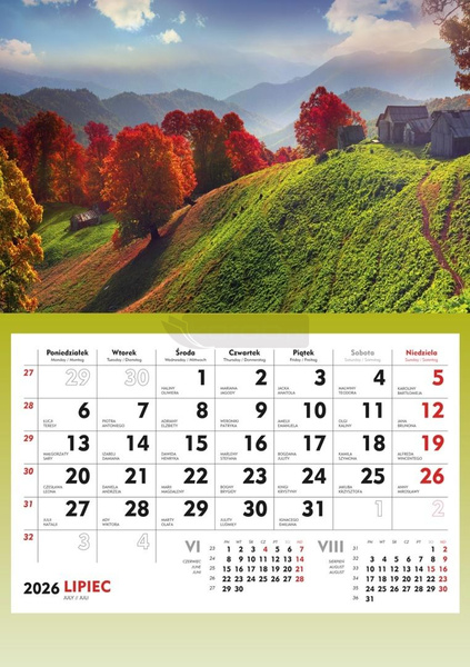 Główka pełnokolorowa, okienko przesuwane, nazwy miesięcy i tygodni w wersjach językowych, miejsce na nadruk reklamowy.