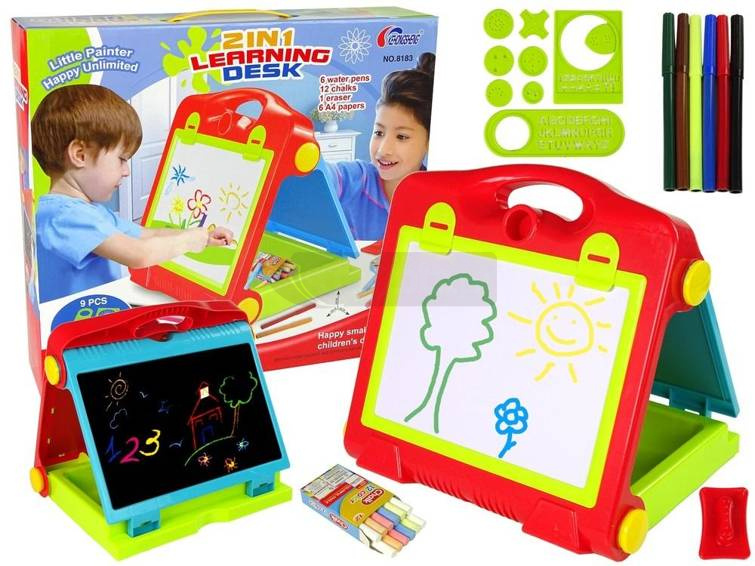 Nowa, edukacyjna, duża tablica zachwyci każdego małego fana prac plastycznych. Na tablicy można pisać flamastrem lub kredą, odrysowywać różne szablony.
