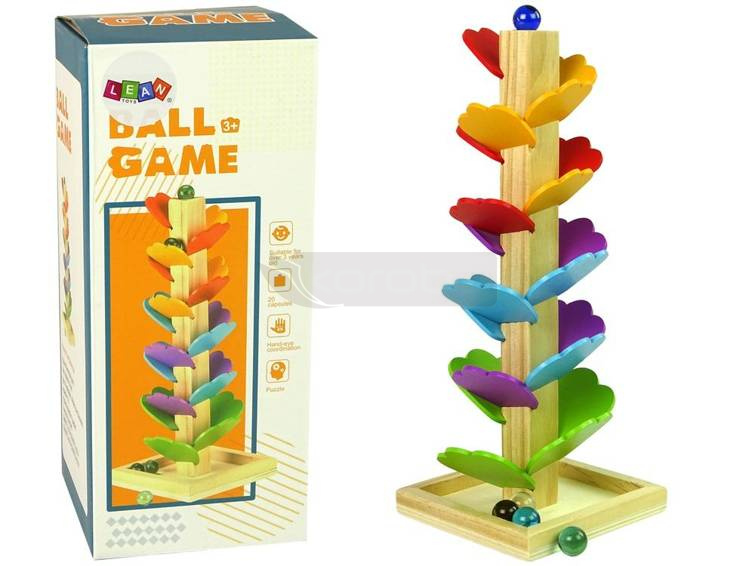 Gra polega na ustawieniu piłeczki na szczycie wieży, która spada, obijając się o kolorowe listki. W pierwszej kolejność maluch musi powkładać listki w odpowiednie miejsca na drzewku, dziecko uczy się precyzji oraz kolorów.