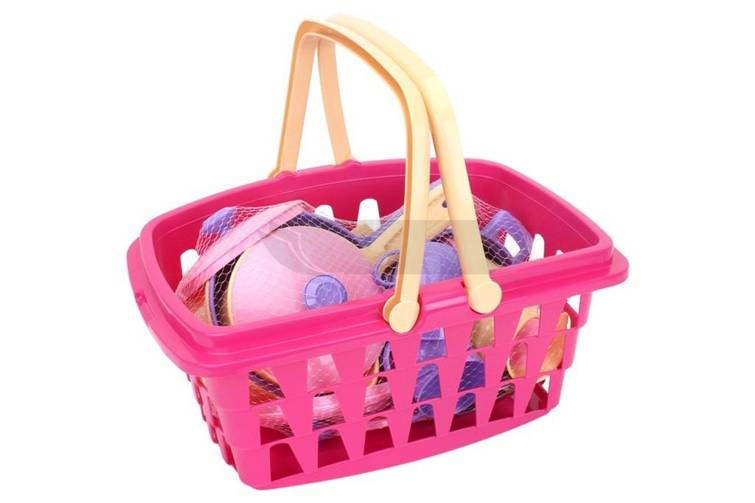 W skład zestawu wchodzą : kosz, 2 patelnie z pokrywką, rondel z pokrywką, patelnia, łopatka, duży widelec, chochla, skimmer, dzbanek do kawy z pokrywką, 4 filiżanki ze spodeczkami i łyżki.