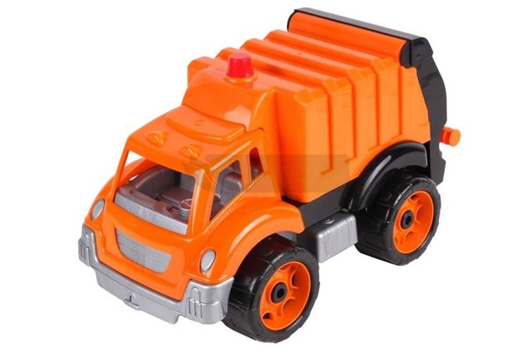 Pojazd- śmieciarka ze zbiornikiem na śmieci i ruchomą pokrywą.