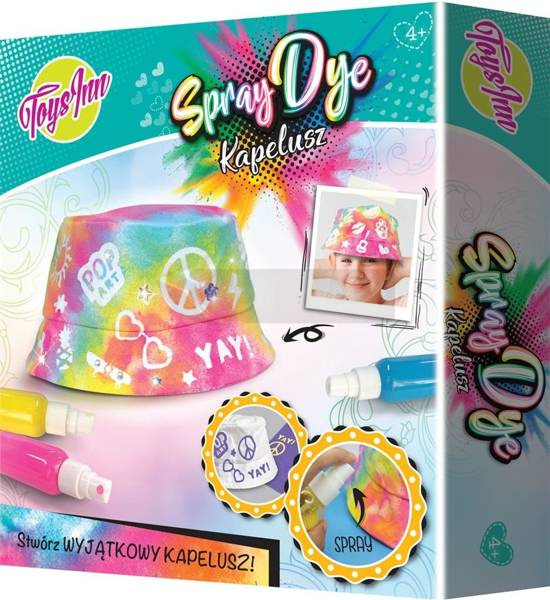 Wyraź swój styl, baw się kolorami i stwórz samodzielnie niepowtarzalny kapelusz. Zestaw zawiera: bawełniany kapelusz, spray do tkanin w 3 kolorach, szablony - 3 arkusze, samoprzylepne dekoracje.