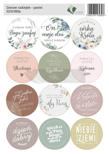 Zestaw naklejek z chrześcijańskimi hasłami w otoczeniu pastelowych barw.